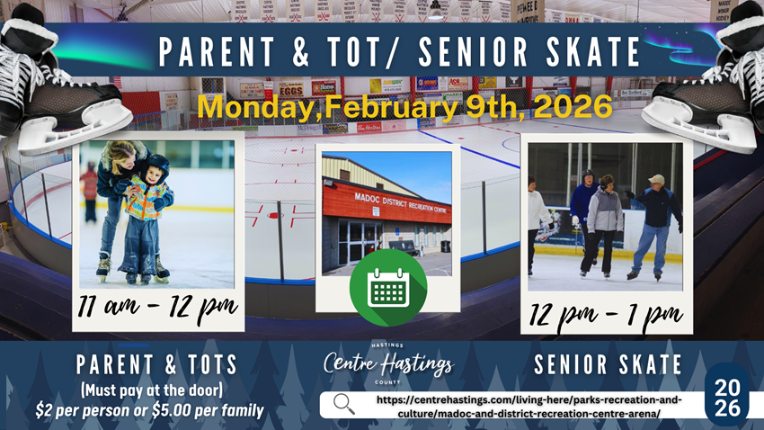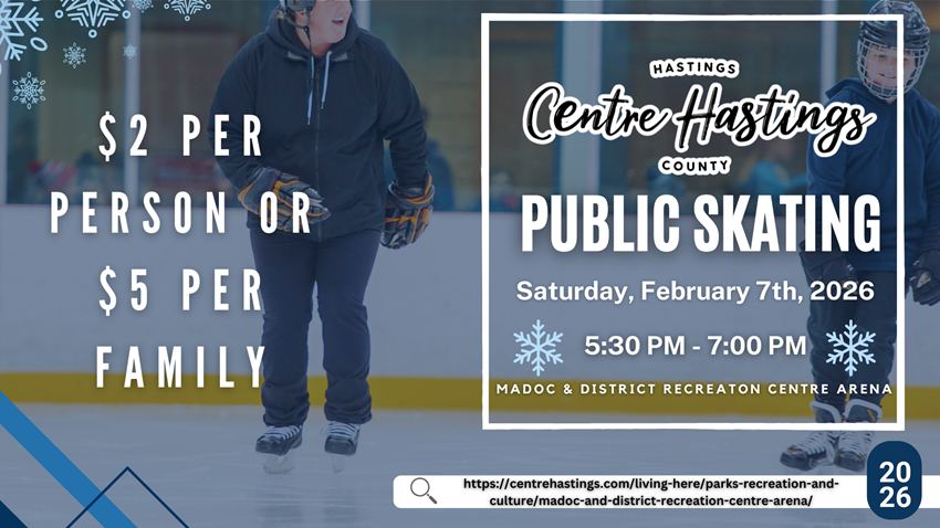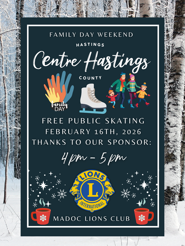 Enjoy free public skating at the Madoc and District Recreation Centre Arena on Monday, February 16, 2026, from 4:00 p.m. to 5:00 p.m., courtesy of the Madoc Lions Club. Thank you!
